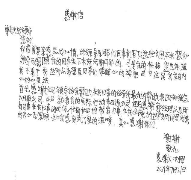 经过半个月治疗休养,刘军手部已无大碍。出院后的他写了一封感谢信并为公司送了一面锦旗,他说道,是kaiyun体育app官网登录入口(中国)官方网站-登录入口这个大家庭让他感受到了关怀和温暖,他表示要把这种关怀变成工作上的动力,争取早日返回工作岗位,努力工作,回报大家的关心和关爱。